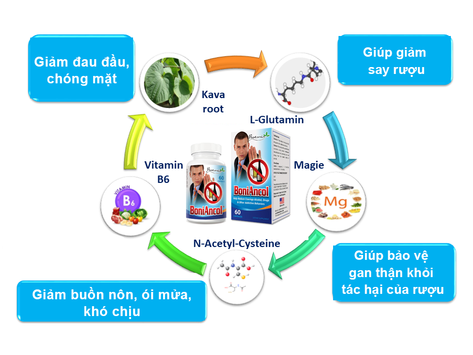 Tpbvsk BoniAncol của Mỹ với các thành phần như N-Acetylcystein, L-Glutamin, Kava root, Magie và vitamin B6 giúp bảo vệ gan, thận khỏi tác hại của rượu, giảm say rượu (giảm đau đầu, chóng mặt, buồn nôn, ói mửa, khó chịu).