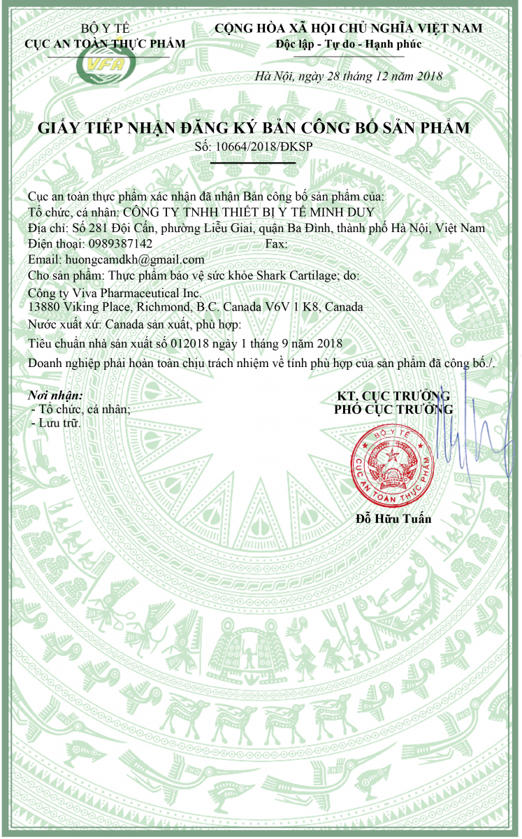 GIẤY PHÉP SHARK CARTILAGE CỦA BỘ Y TẾ