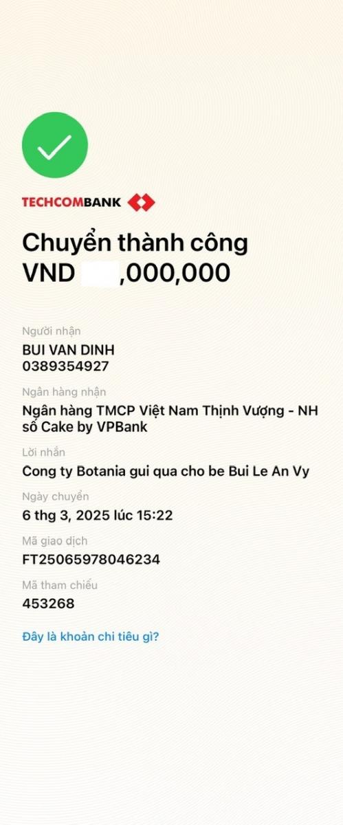 Vì không thể tới tận nơi nên công ty Botania đã chuyển khoản giúp đỡ bé An Vy