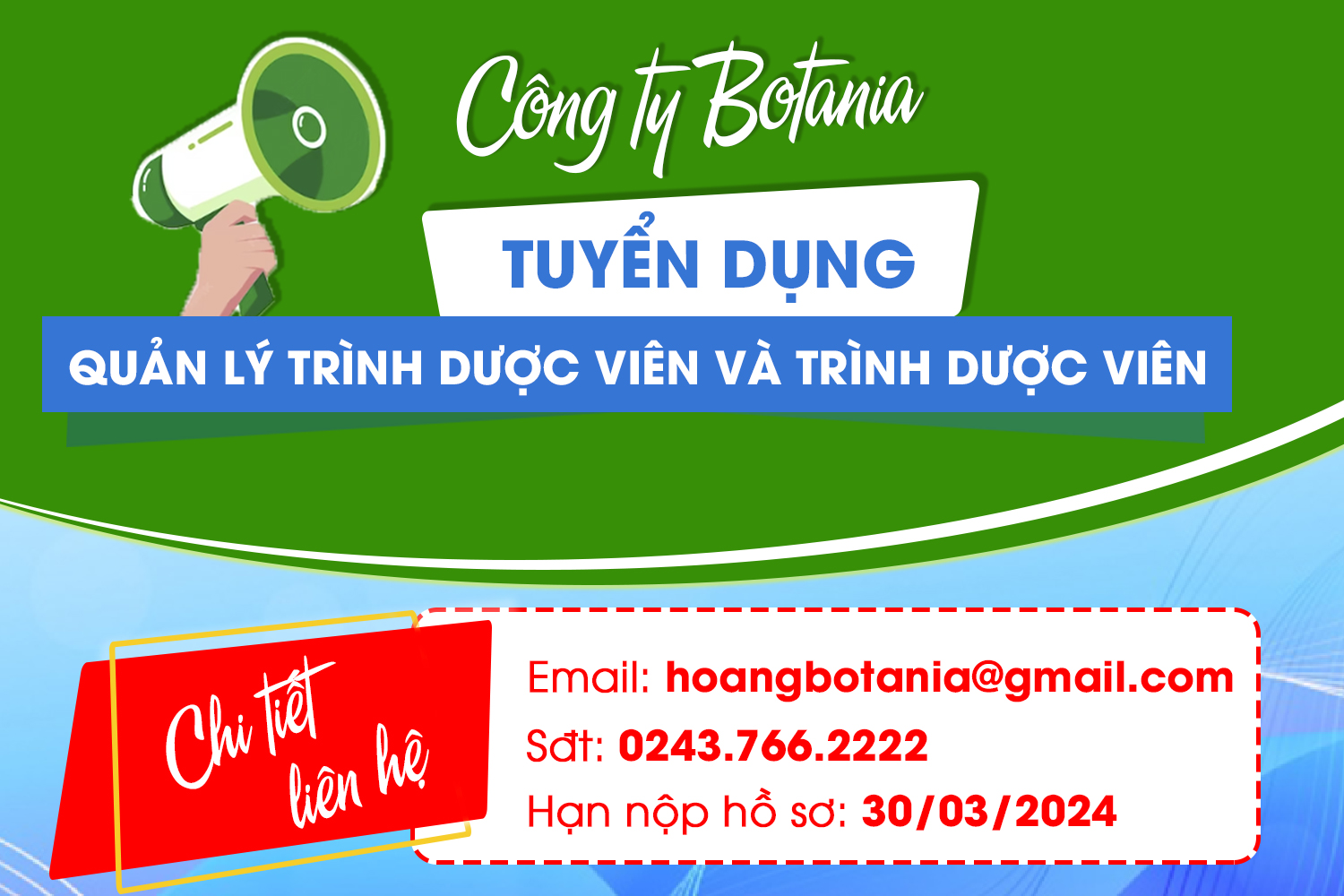 Công ty Botania là công ty đi đầu trong lĩnh vực nhập khẩu, phân phối các sản phẩm thực phẩm bảo vệ sức khỏe của Mỹ và Canada tại Việt Nam. Hệ thống phân phối của công ty Botania đã phủ khắp cả nước. Hiện nay, công ty Botania có nhu cầu tuyển dụng vị trí quản lý trình dược viên khu vực Đông Bắc và trình dược viên các tỉnh Hà Nội, Phú Yên, Lạng Sơn, Quảng Nam