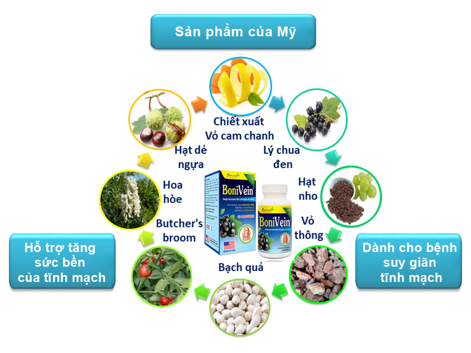 Tpbvsk BoniVein nhập khẩu nguyên lọ của Mỹ, với các thành phần là các thảo dược thiên nhiên : hỗ trợ tăng sức bền của tĩnh mạch, hỗ trợ giảm tê bì chân, nặng chân do phồng tĩnh mạch, dành cho bệnh nhân bị suy giãn tĩnh mạch.