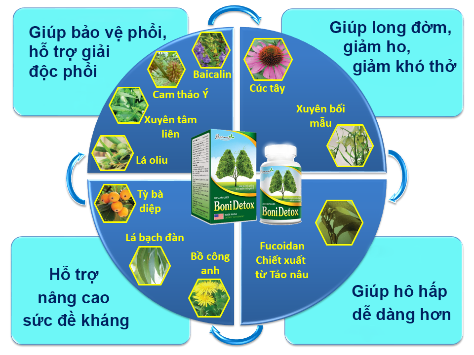 Đồng thời chị nên kết hợp thêm sử dụng sản phẩm BoniDetox có chứa các thảo dược như baicalin, fucoidan, xuyên tâm liên, xuyên bối mẫu, lá ô liu, cam thảo italia, cúc tây… giúp giảm ho, đờm, khó thở, hỗ trợ bảo vệ và giải độc phổi, nâng cao sức đề kháng cho mình nhé!