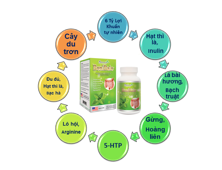 Chú có thể tham khảo sử dụng sản phẩm BoniBaio, đây là sản phẩm nhập khẩu nguyên lọ từ Mỹ, chứa 6 tỷ lợi khuẩn, 5-HTP và hàng loạt các thảo dược khác như gừng, bạch truật, hoàng liên, đu đủ, lô hội, L-arginine, bạc hà, lá bài hương, cây du trơn, gừng, bạch truật, hoàng liên, hạt thìa là.